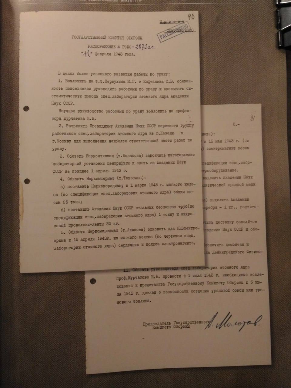 «Научное руководство работами по урану возложить на профессора Курчатова И.В. Обязать руководителя спец. лаборатории атомного ядра проф. Курчатова И.В. провести к 1 июля 1943 г. необходимые исследования и представить Государственному Комитету Обороны к 5 июля 1943 г. доклад о возможности создания урановой бомбы…».