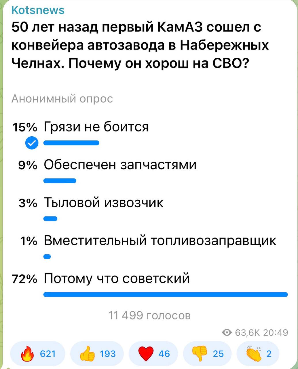 72 процента подписчиков считают, что КАМАЗ хорош тем, что он родом из СССР. А значит недорогой, надежный, многочисленный. И отремонтировать его можно в полевых условиях - с помощью лома и такой-то матери.