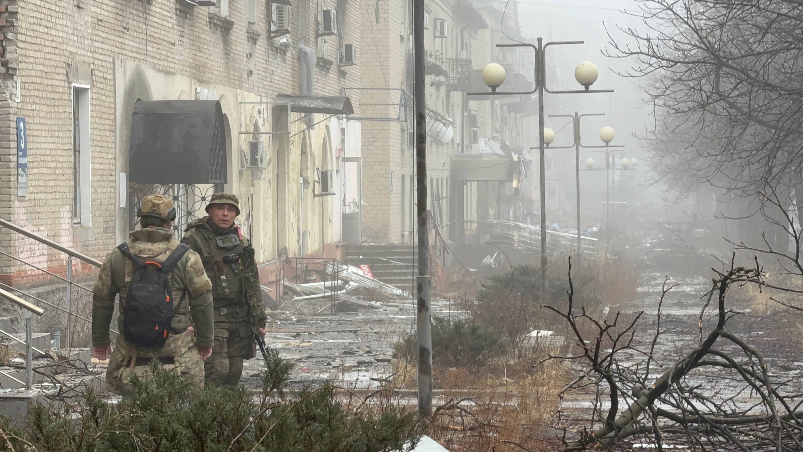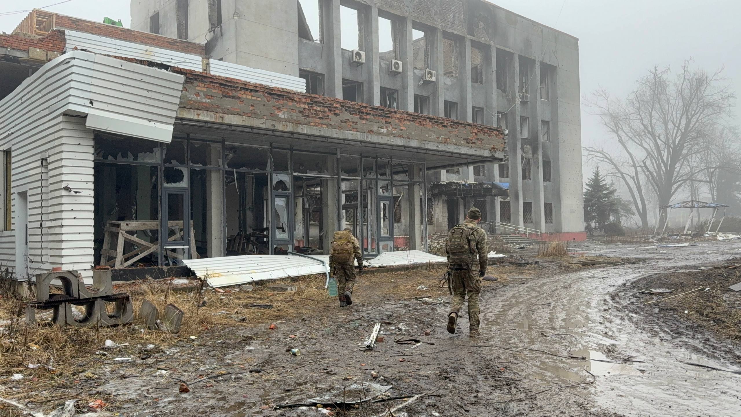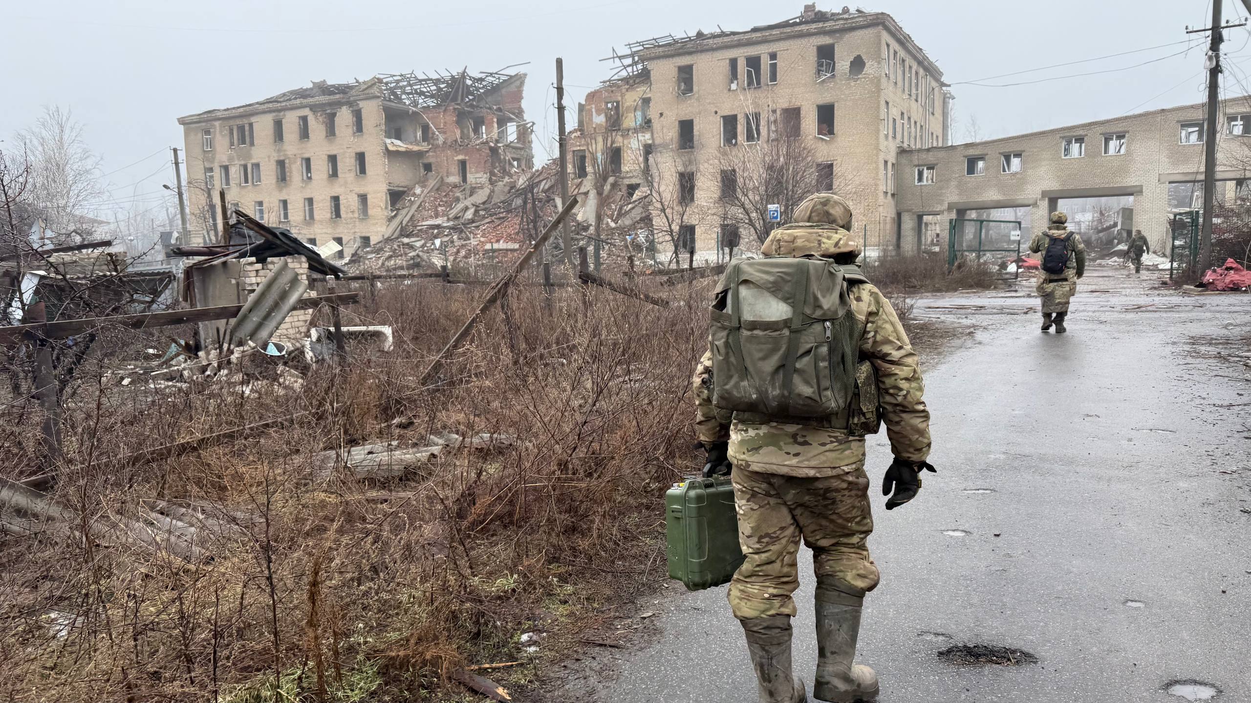 Вместе с очередным проводником двигаемся к центру, наблюдая, как живет прифронтовая логистика, пока позволяет погода. Весь город приходит в движение и такелажники своими «муравьиными» тропами молча двигаются пешком из одного конца города в другой. Туда тащат на себе боеприпасы и топливо, обратно — пустые канистры и тележки с ранеными. Мы топаем своей дорогой, проходя мимо разбитого корпуса центральной больницы. У пандуса приемного покоя — свежая кровь на сером бетоне. Обгоняем связистов, которые тянут куда-то оптоволокно, чтобы запустить интернет на очередном ППУ.