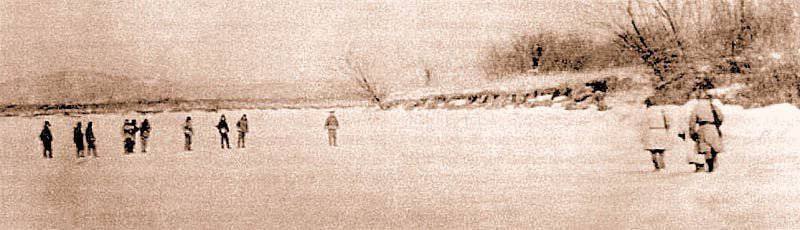… Трое погранцов в белых полушубках идут по льду Уссури навстречу нарушителям. Начальник заставы, старший лейтенант Иван Стрельников, старший лейтенант Николай Буйневич, рядовой Анатолий Денисенко. Еще трое наших – за их спиной, в том числе фотограф. Никто не подозревает, что засада притаилась справа, на высоком берегу. Петров успевает несколько раз нажать на затвор фотоаппарата, прежде чем пограннаряд попал под ураганный огонь в упор.