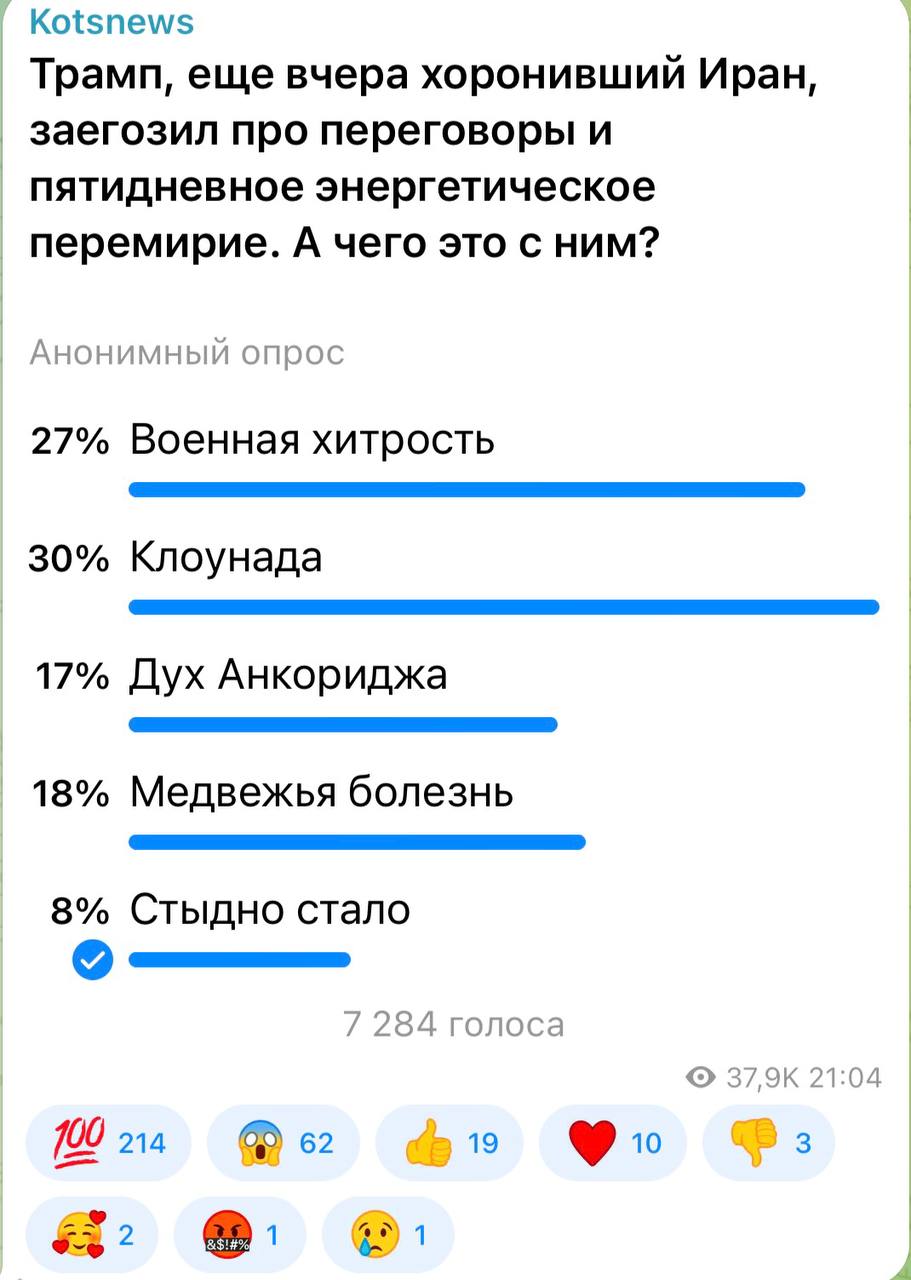 30 процентов подписчиков считают, что Трампом движет привычная клоунада. Старика-маразматика Байдена еще хорошим словом вспомним.