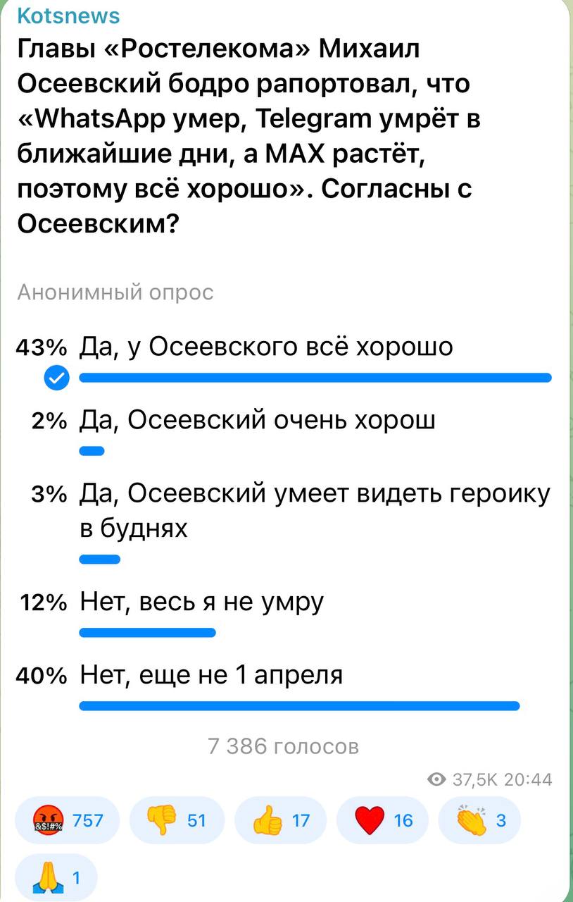 43 процента подписчиков считают, что у Осеевского - все хорошо. В его реальности нет никаких проблем и все идет по плану. Даже в окно не надо выглядывать. Обо всем, что нужно, сообщат услужливые и вежливые подчиненные.