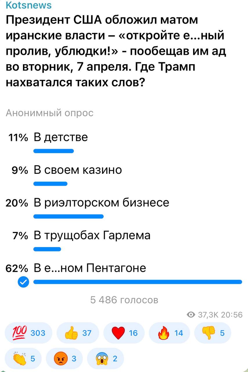 62 процента подписчиков считают, что Трамп нахватался таких слов в Пентагоне. Военные, как известно, матом не ругаются. Они на нем разговаривают. А вот первому лицу не мешало бы следить за метлой.