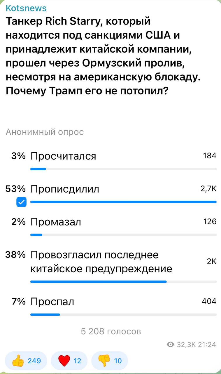 Александр Коц: 53 процентов подписчиков считают, что Трамп прописдилил блокаду Ормуза