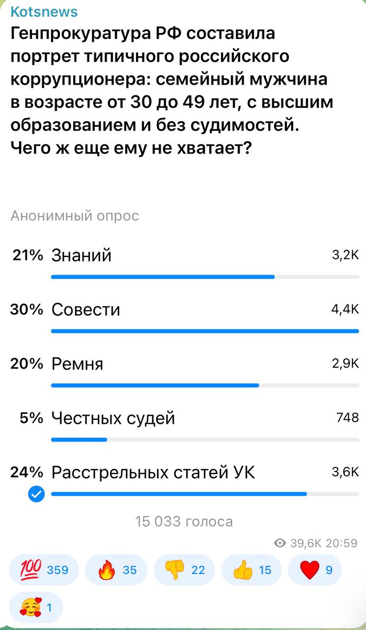 30 процентов подписчиков считают, что коррупционерам не хватает совести. Она была, пожалуй, только у «голубого воришки» Альхена из «12 стульев». Воровал и плакал.