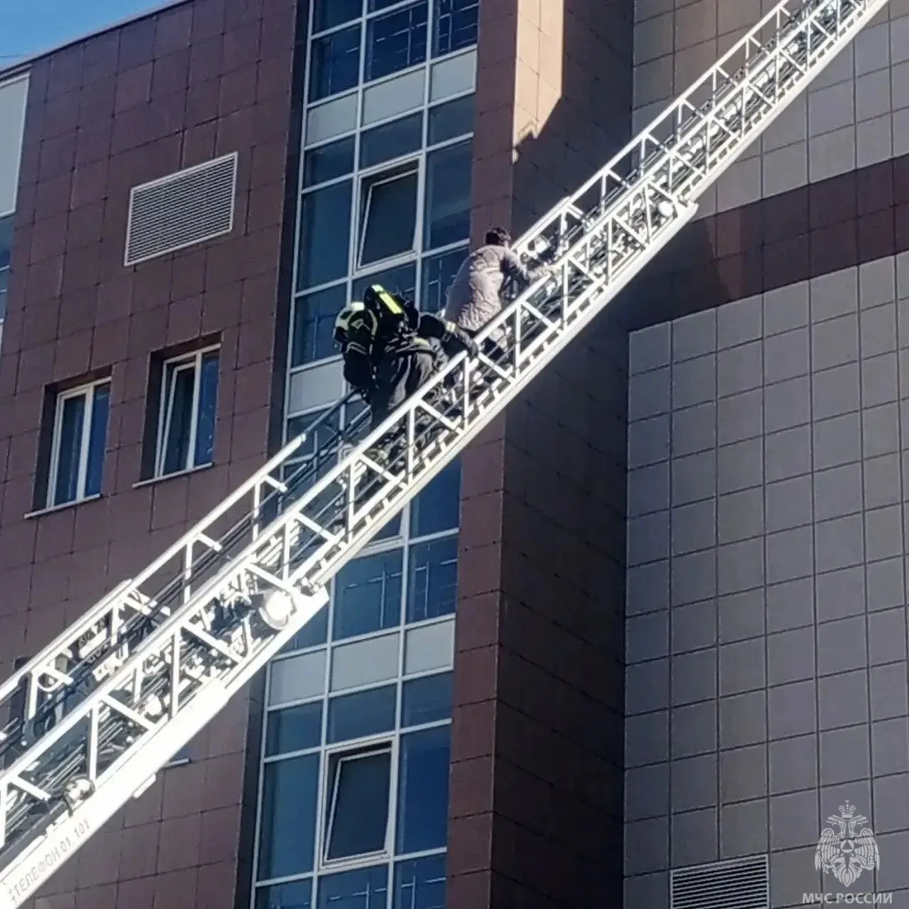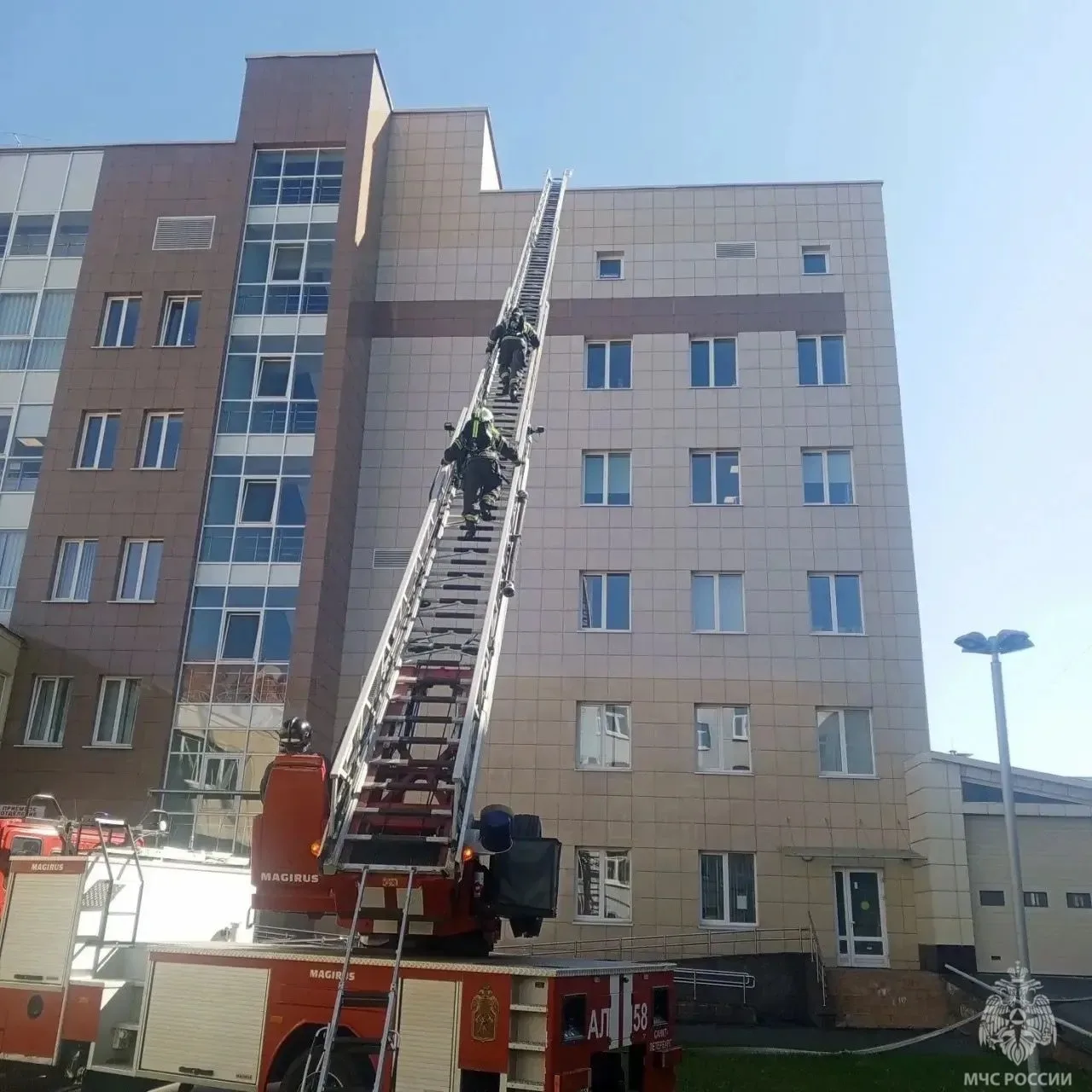 Прибывшие к месту сотрудники #МЧС_Петербурга в кратчайшее время ликвидировали условное возгорание. Однако едкий дым, моментально распространившийся по зданию, оставил в заложниках двух сотрудников. Огнеборцы помогли одному из них выбраться при помощи спасательного устройства по маршевой лестнице, а второго эвакуировали при помощи автолестницы.