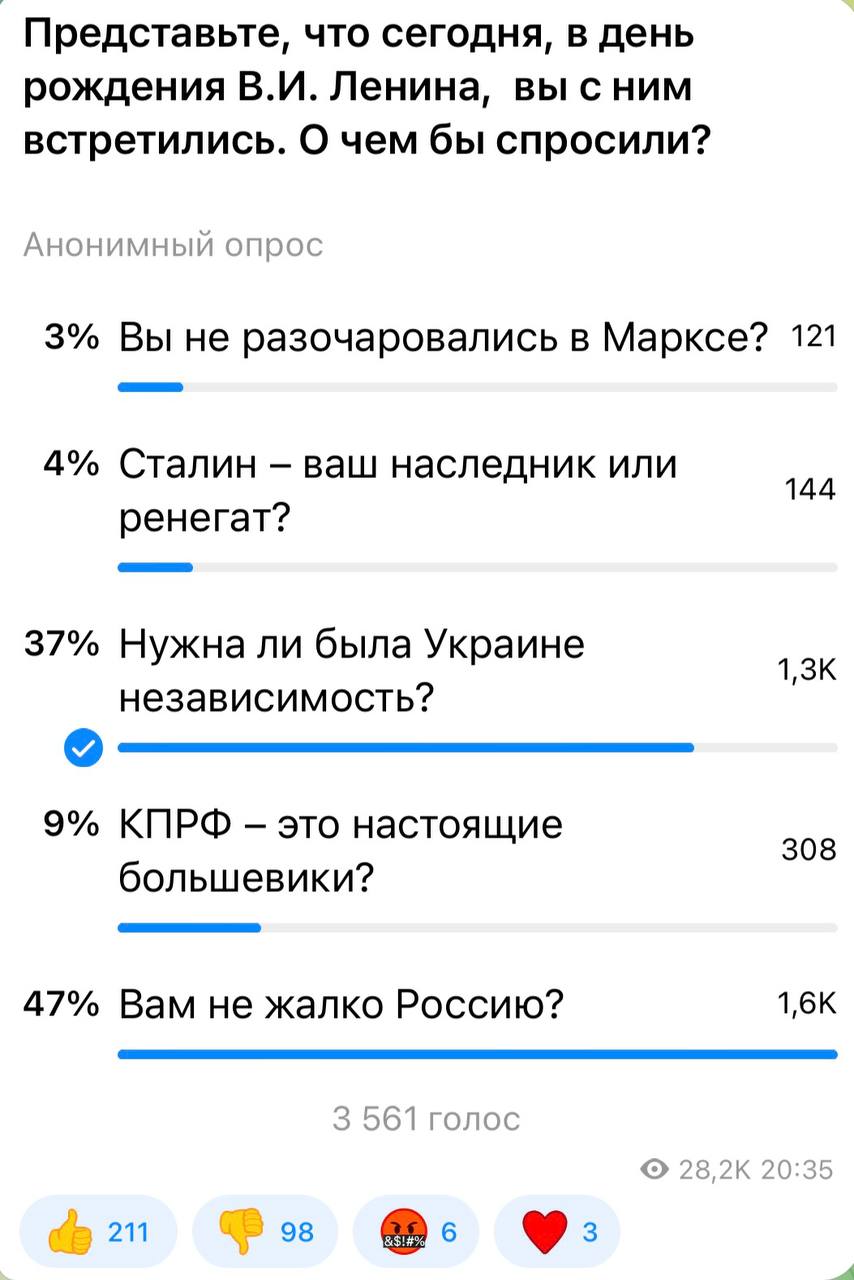 47 процентов подписчиков спросили бы у Ленина, не жалко ли ему Россию. Наверное, даже Ильич не нашелся бы, что ответить. Настолько все у нас запутанно.