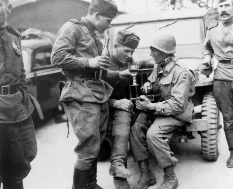 «Тут же, на лужайке, были расстелены плащ-палатки, выставлены русская водка и нехитрая закуска. И наши, и американские солдаты провозглашали тосты за то, чтобы никогда не было войны, за дружбу, скрепленную кровью в борьбе с общим врагом за мир».