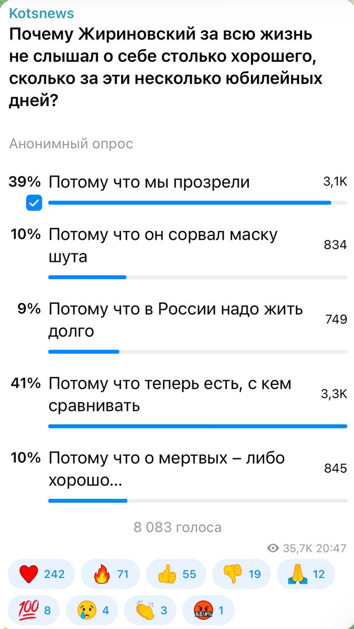 ОПРОС 41 процент подписчиков считает, что теперь есть, с кем сравнивать. Жириновский, как ни крути, символ эпохи. Подобных ему сегодня исчезающе мало.