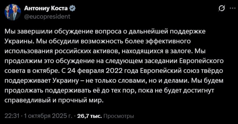 Несмотря на заявления руководства ЕС о предоставлении «репарационного кредита» Украине, Бельгия отказалась самостоятельно изымать или использовать замороженные российские активы и потребовала гарантий разделения финансовых рисков со стороны всех стран ЕС.