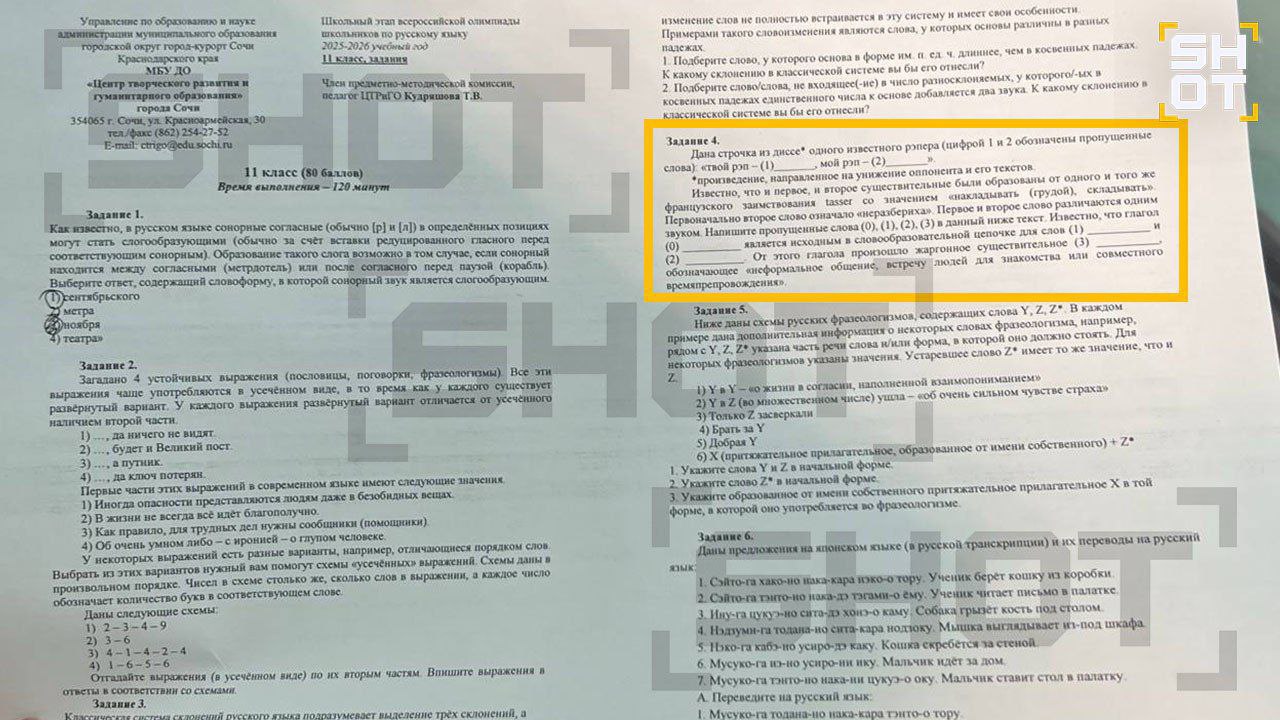 В беседе с SHOT ученики школы № 25 в Сочи рассказали, что на недавней олимпиаде по русскому языку им попалась строчка из старого трека Оксимирона: «Твой рэп — подтасовка, мой рэп — потасовка». В задании иноагента называют «известным рэпером».