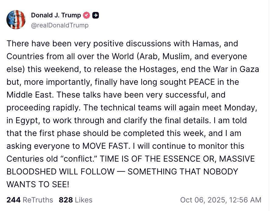 Трамп заявил, что были проведены «очень позитивные» переговоры с ХАМАС и странами мира об освобождении заложников, прекращении войны в Газе и достижении мира на Ближнем Востоке. Технические группы продолжат работу в Египте, чтобы завершить первый этап на этой неделе. Он призвал действовать быстро, чтобы избежать кровопролития.