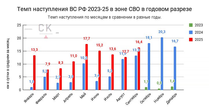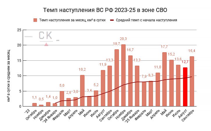 Среднесуточный темп продвижения ВС РФ в зоне проведения СВО в сентябре 2025 составил +16,4 км. Средний темп продвижения за всё время наступления к октябрю 2025 равен 9,68 км в сутки.