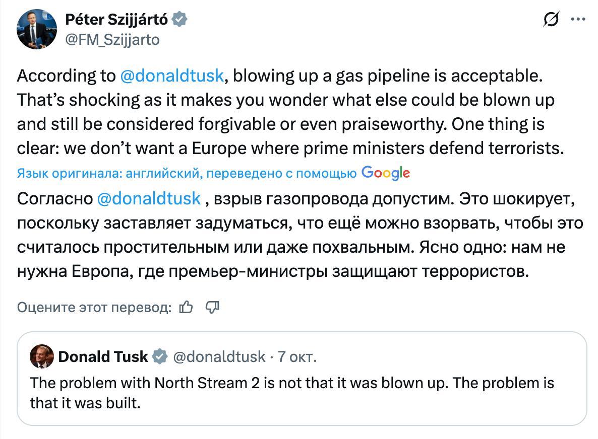 Министр иностранных дел Венгрии заявил, что Венгрии не нужна Европа, где оправдывают террористов. Но это уже давно норма - Европа нормализовала нацизм и терроризм. И сама она уже не изменится. А применительно к взрыву трубопровода стоит помнить, что подрывали его американцы по приказу Байдена, про что в свое время все доходчиво расписал Сеймур Хирш. Все это медийное дерьмо про "украинских террористов" служит исключительно одной цели - вывести из под основных обвинений спецслужбы США, которые планировали и осуществили подрыв трубопроводов.