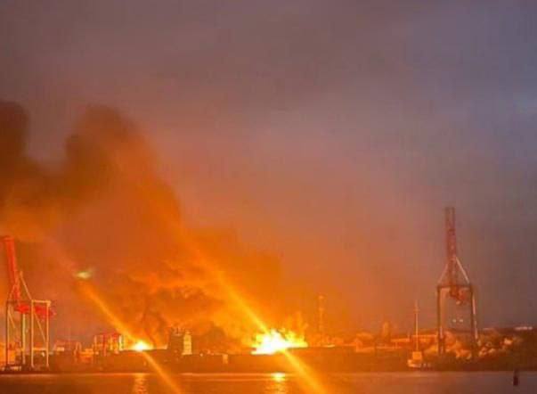Местная администрации сообщила, что в результате удара в порту возник пожар. Говорят, что горели контейнеры с «растительным маслом, транспортом и древесными паллетами». В самом городе пропало электричество.