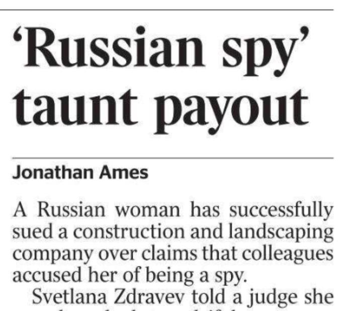 Женщина русского происхождения Светлана Здравев (типичная же русская фамилия!) выиграла суд в связи с ее незаконным увольнением и харрасментом «на расовой почве». Она говорит, что ее вечно показывали за русский акцент и шутили по поводу ее российского происхождения. А после начала СВО у нее всегда спрашивали, не является ли она «русской шпионкой». Кроме того, кто-то из начальства признался, что он ненавидит все, связанное с Россией и русскими. Опять-таки обычное дело для современной Британии! О черных или евреях так нельзя говорить, а о русских можно.