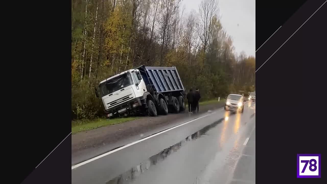 Рядом стоит ещё одна легковушка, у неё повреждения незначительные. Кроме того, один грузовик съехал с дороги и едва не опрокинулся в кювет.