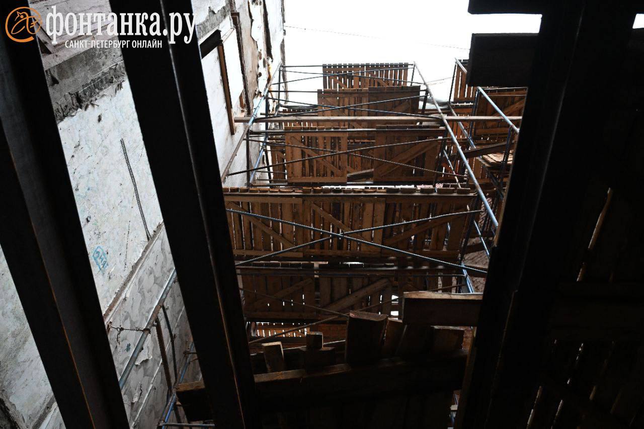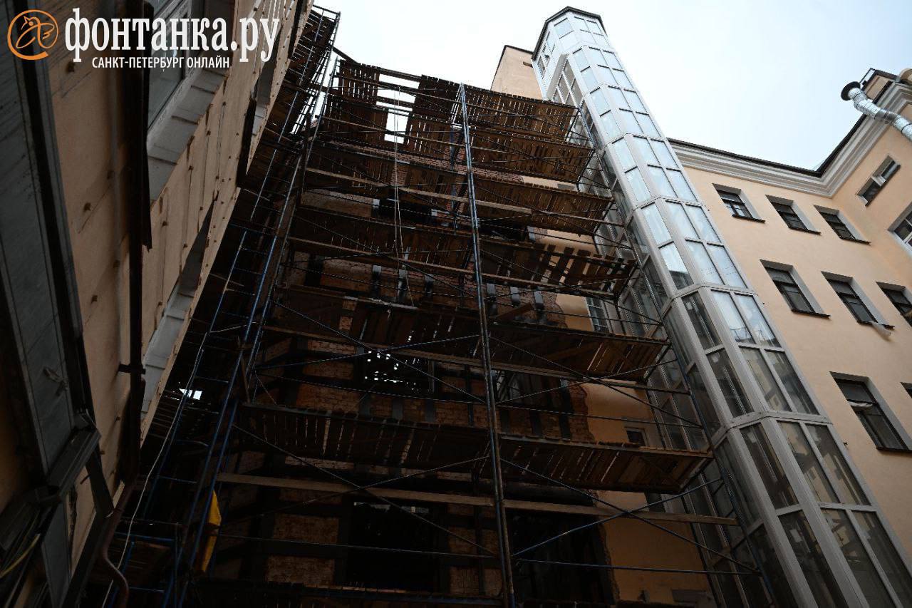 Так сейчас выглядит дом на Большой Зелениной, 1, обрушившийся в августе прошлого года. В фонде капремота подчеркнули, что уже выполнен монтаж некоторых перекрытий и капитальной стены до уровня пола четвертого этажа, а также пересобрана дворовая стена с заменой кирпичной кладки и укреплением.
