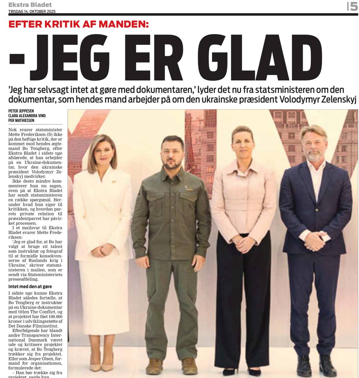 В связи с дурно пахнущим коррупционным скандалом вокруг съемок фильма о Зеленском мужем премьера Дании (я писал об этом здесь) газета Ekstra Bladet получила короткие электронные ответы от Метте Фредриксен и ее мужа Бо Тенгберга. Даже не ответы, а отписки. Премьер ответила следующее: