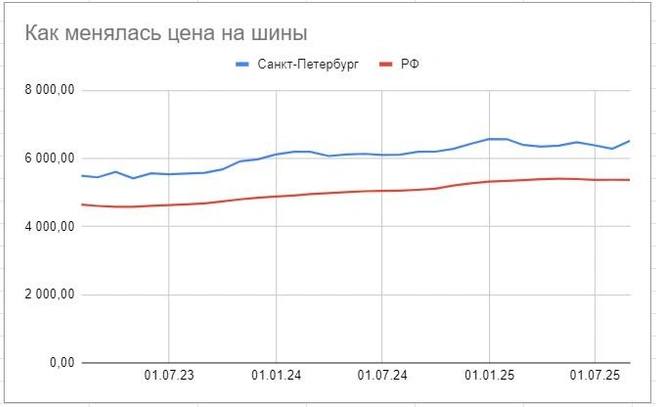 Средний ценник на шины в Петербурге стабильно обгоняет показатель по стране. По данным Росстата, c начала 2023-го к августу этого года разрыв увеличился с 850 рублей до почти 1200.