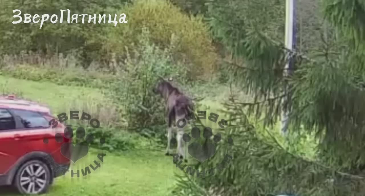 В распоряжении ЗвероПятницы оказались эксклюзивные кадры, как лось Марусь крушит автомобиль, а потом по очереди с оленями лопает садовые кустарники.