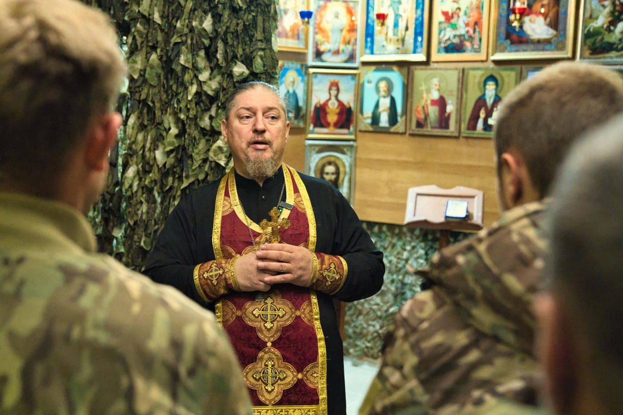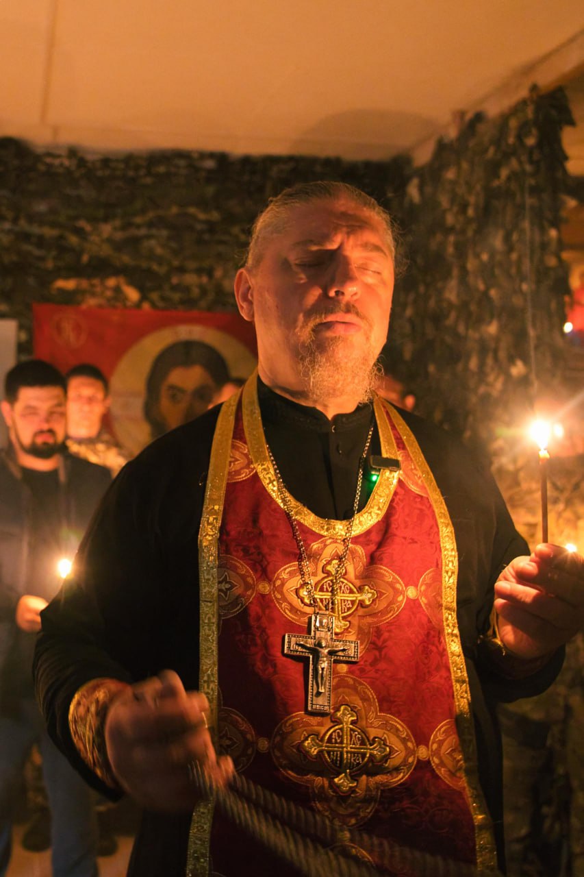 Отец «Крёстный» приехал в камуфляжной куртке, с крестом. Исповедовал бойцов, причастил, провёл молебен.