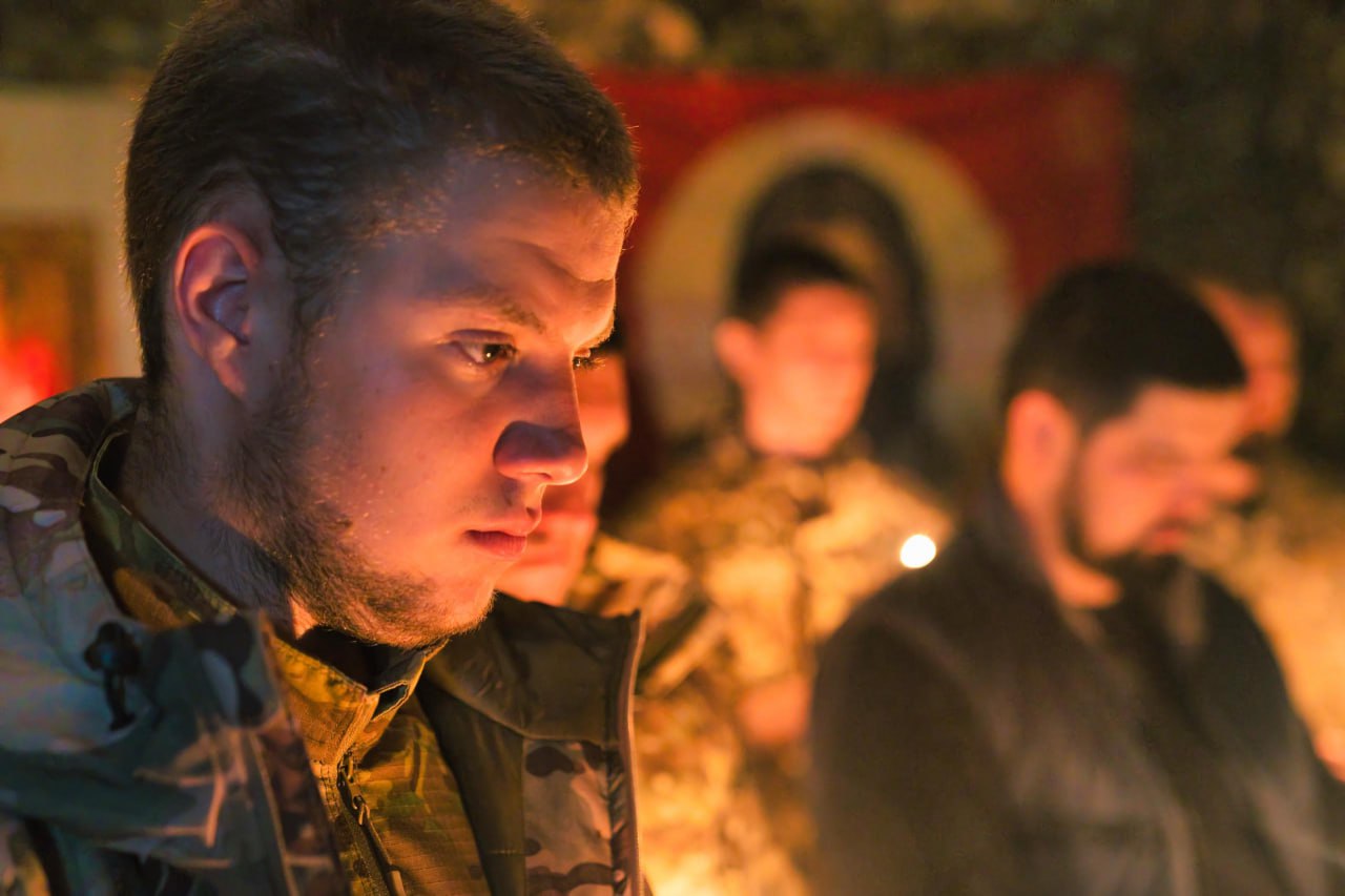 После службы «Крёстный» поговорил с бойцами: про жизнь, про веру, про то, как правильно держаться. Мужчина, короче.