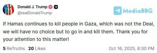Если ХАМАС продолжит убивать людей в Газе, что не было предусмотрено соглашением, у нас не останется другого выбора, кроме как пойти и убить их.Благодарю Вас за внимание к этому вопросу!