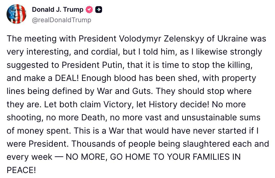 "Встреча с президентом Украины Владимиром Зеленским была очень интересной и дружелюбной, но я сказал ему, как и настоятельно рекомендовал президенту Путину, что пора прекратить убийства и заключить соглашение! Крови пролито достаточно, границы собственности определяются войной и мужеством. Они должны остановиться там, где находятся. Пусть оба заявят о победе, пусть история решит! Больше никаких выстрелов, больше никакой смерти, больше никаких огромных и непосильных расходов. Это война, которая никогда бы не началась, если бы я был президентом. Тысячи людей убиваются каждую неделю — ХВАТИТ, ИДИТЕ ДОМОЙ К СВОИМ СЕМЬЯМ В МИРЕ", — написал президент США.