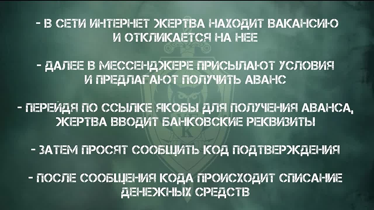 В сети Интернет на сервисе объявлений жертва находит вакансию, откликается на нее. Далее в мессенджере присылают условия работы и предлагают получить аванс. Перейдя по ссылке якобы для получения аванса, жертва вводит банковские реквизиты. Затем просят сообщить код подтверждения, после чего происходит списание денежных средств.