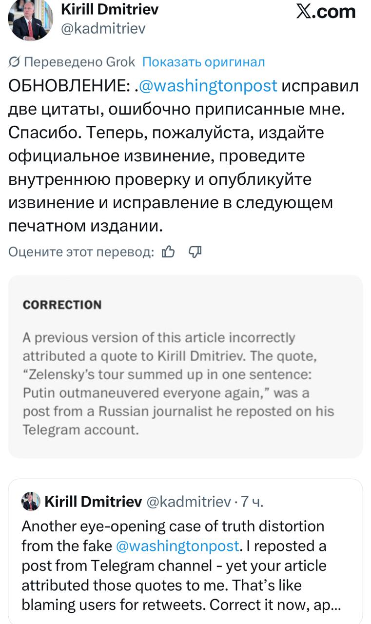Washington Post пришлось внести исправления в статью, где спецпредставителю Президента Кириллу Дмитриеву приписали чужие слова.