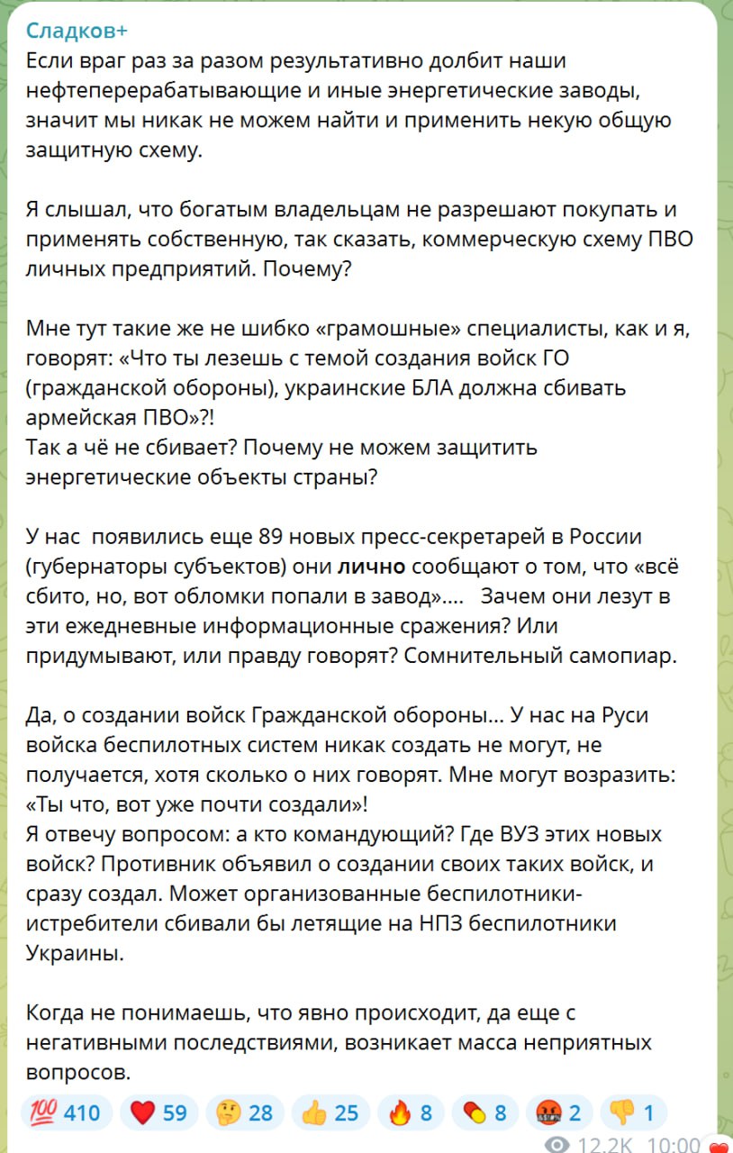 Тов. Сладков, как и многие, недоумевают с какого перепуга никак не удается организовать полную защиту НПЗ и иных предприятий от прилётов крайне нехитрых украинских дронов.