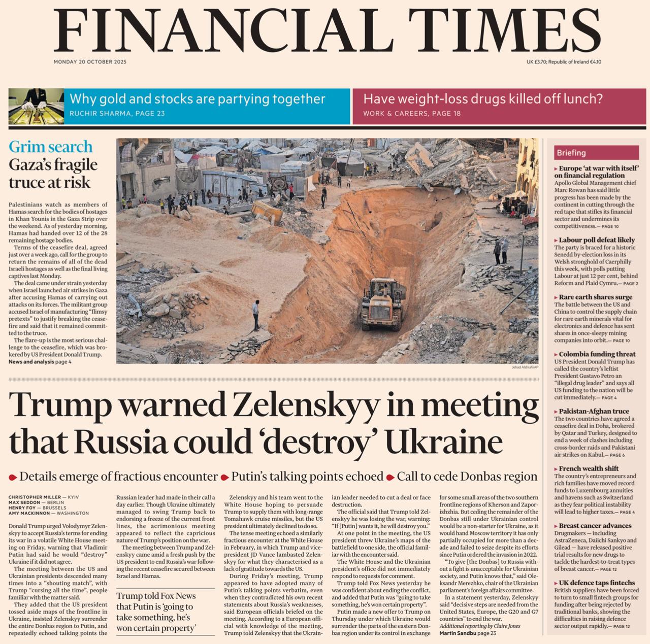 Вот и Financial Times сегодня на первой полосе приводит ту же историю, которую поведала The Daily Telegraph - о том, как Трамп в пятницу орал на Зеленского и требовал отдать России весь Донбасс. Видимо, одни и те же источники у обоих изданий.