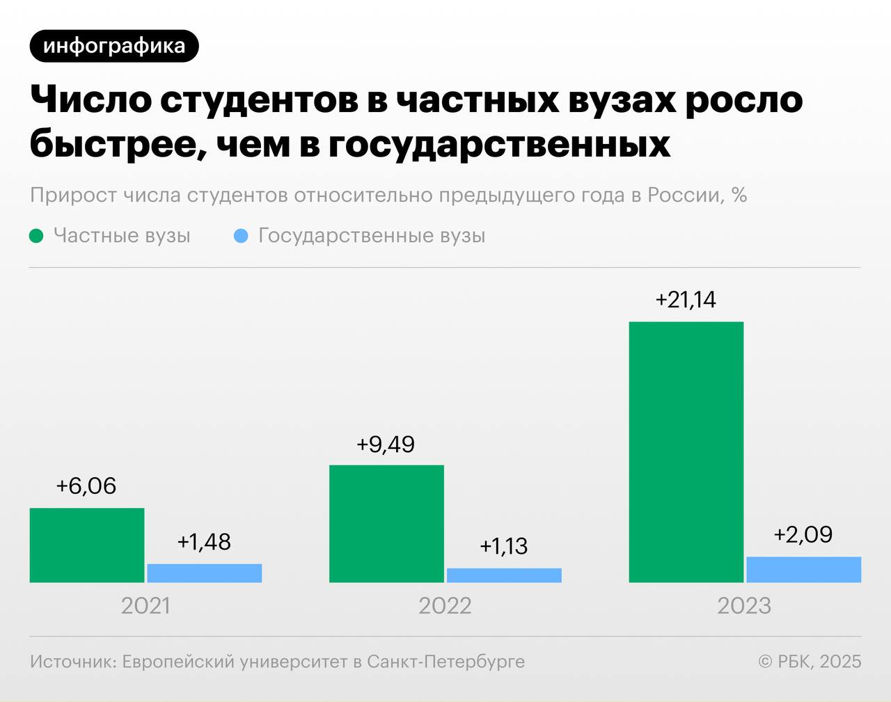 Число студентов в негосударственных высших учебных заведениях в последние годы растет быстрее, чем число студентов в государственных, показало исследование Европейского университета в Санкт-Петербурге тенденций в частном образовании за последние десять лет, с которым ознакомился РБК.