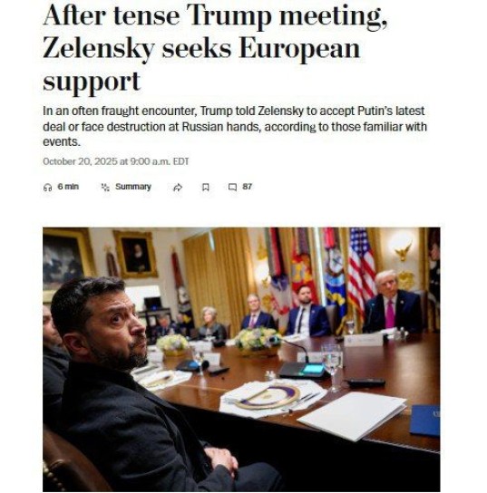 ‘Европейский дипломат, присутствовавший на встрече в Белом доме, назвал её провальной и сказал, что Трамп также ‘всё говорил и говорил’ о ‘своих обидах из-за того, что он не получил Нобелевскую премию мира’.