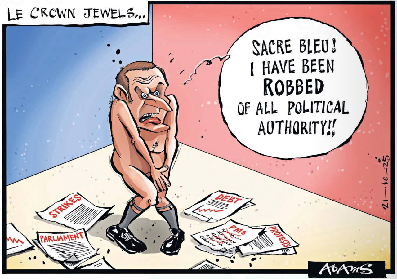 Главным посмешищем в мире сейчас, конечно, является Макрон. После ограбления Лувра особенно издевается над ним британская пресса. The Daily Telegraph сегодня рисует такую картинку: «Боже мой! Меня ограбили, лишив всякой политической власти!!»
