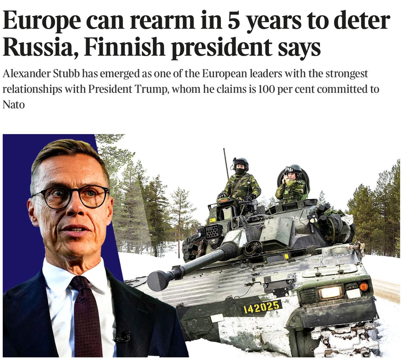 Правда, интервью было взято до его общения с Зеленским по итогам обеда в Белом доме. Поэтому Стубб в нем еще не комментирует итоги замечательного вояжа украинского комика в Вашингтон. А рассказывает свои привычные мантры о том, что Европа должна перевооружиться в течение пяти лет, чтобы противостоять России, и о том, что Россию «надо принудить к миру». И якобы именно Трамп сможет сделать это.