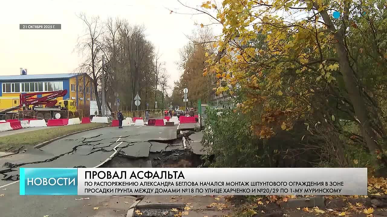 В зоне просадки грунта на 1-м Муринском проспекте специалисты укрепляют линию обрыва и монтируют временную систему водоотведения
