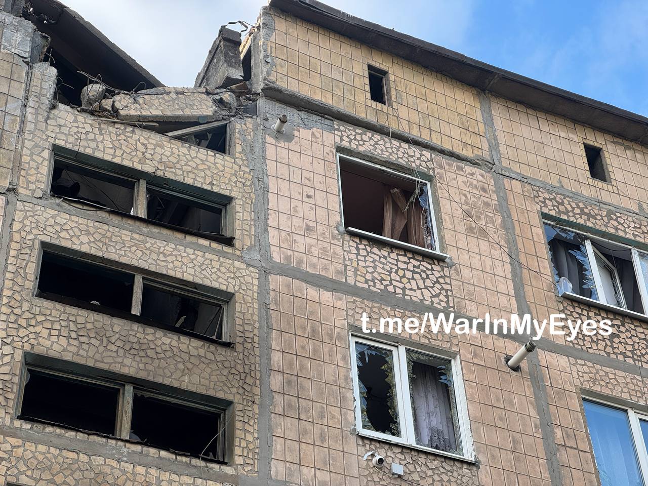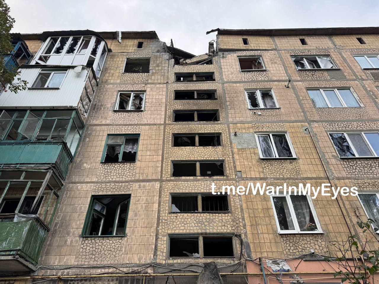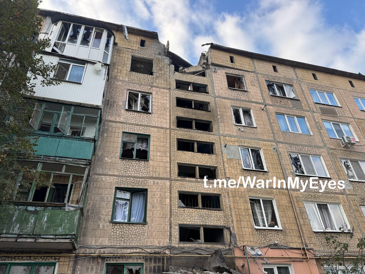 Последствия прилета дрона в 5-ти этажный жилой дом на 103 микрорайоне в Ясиноватой