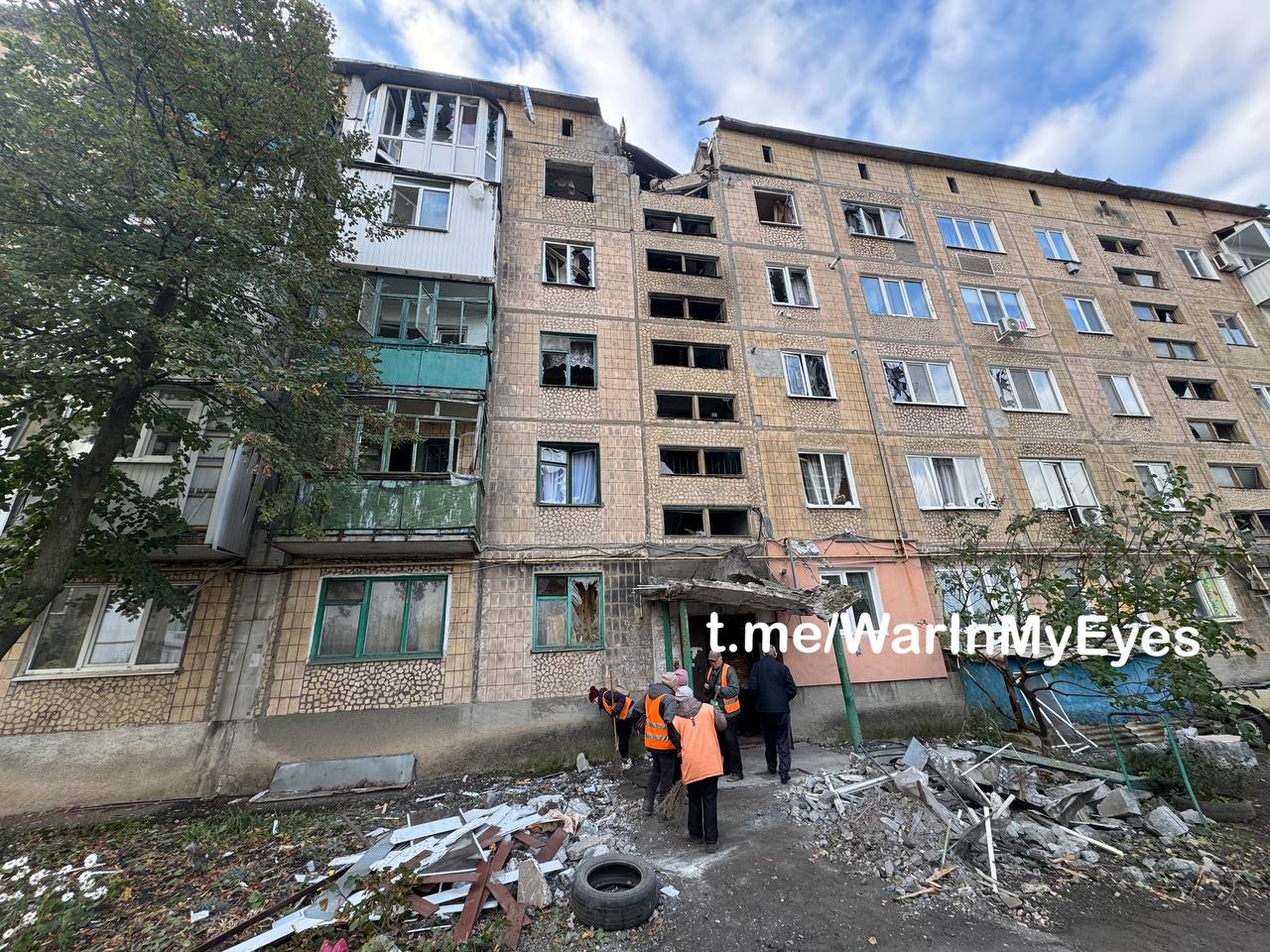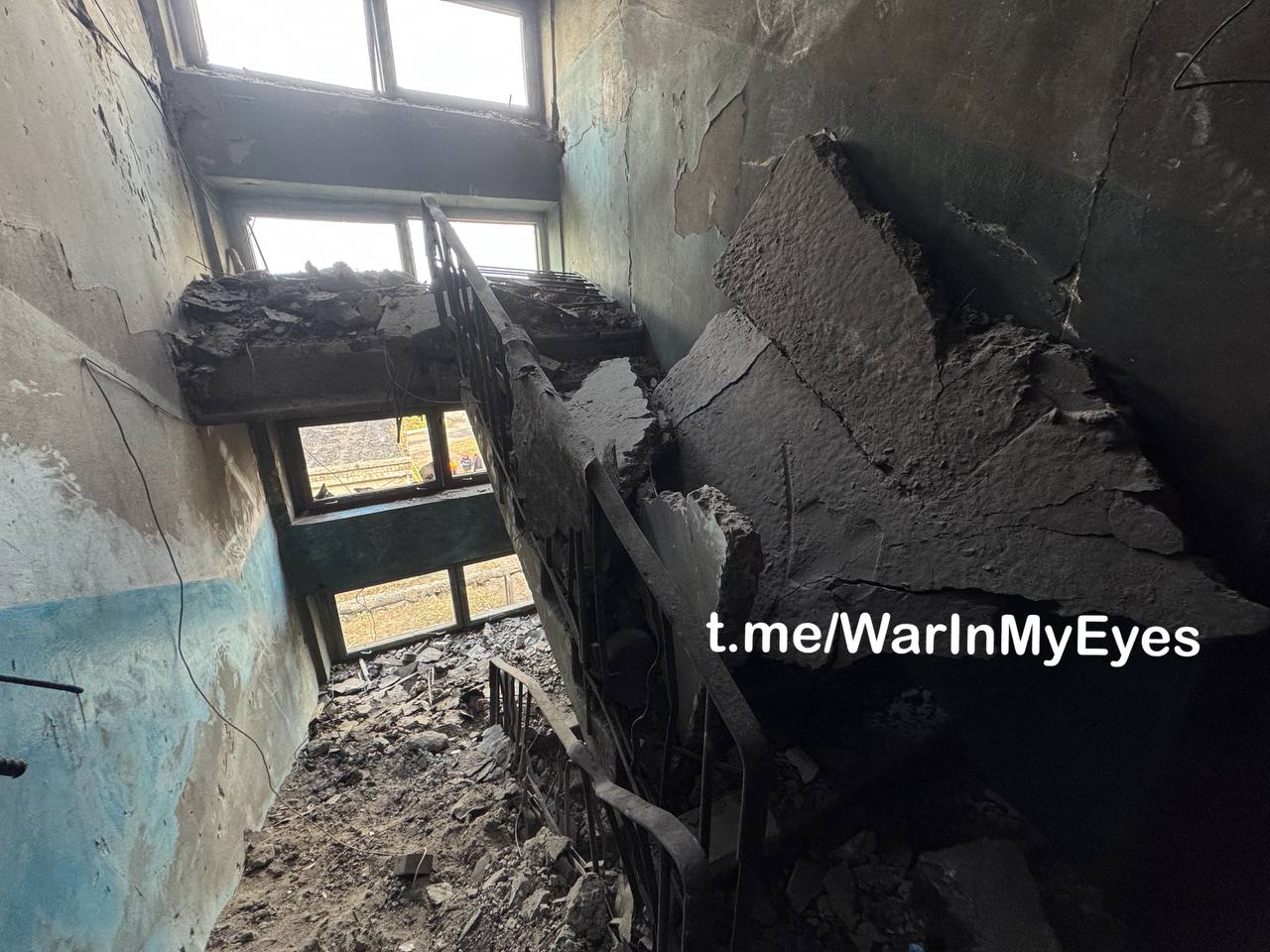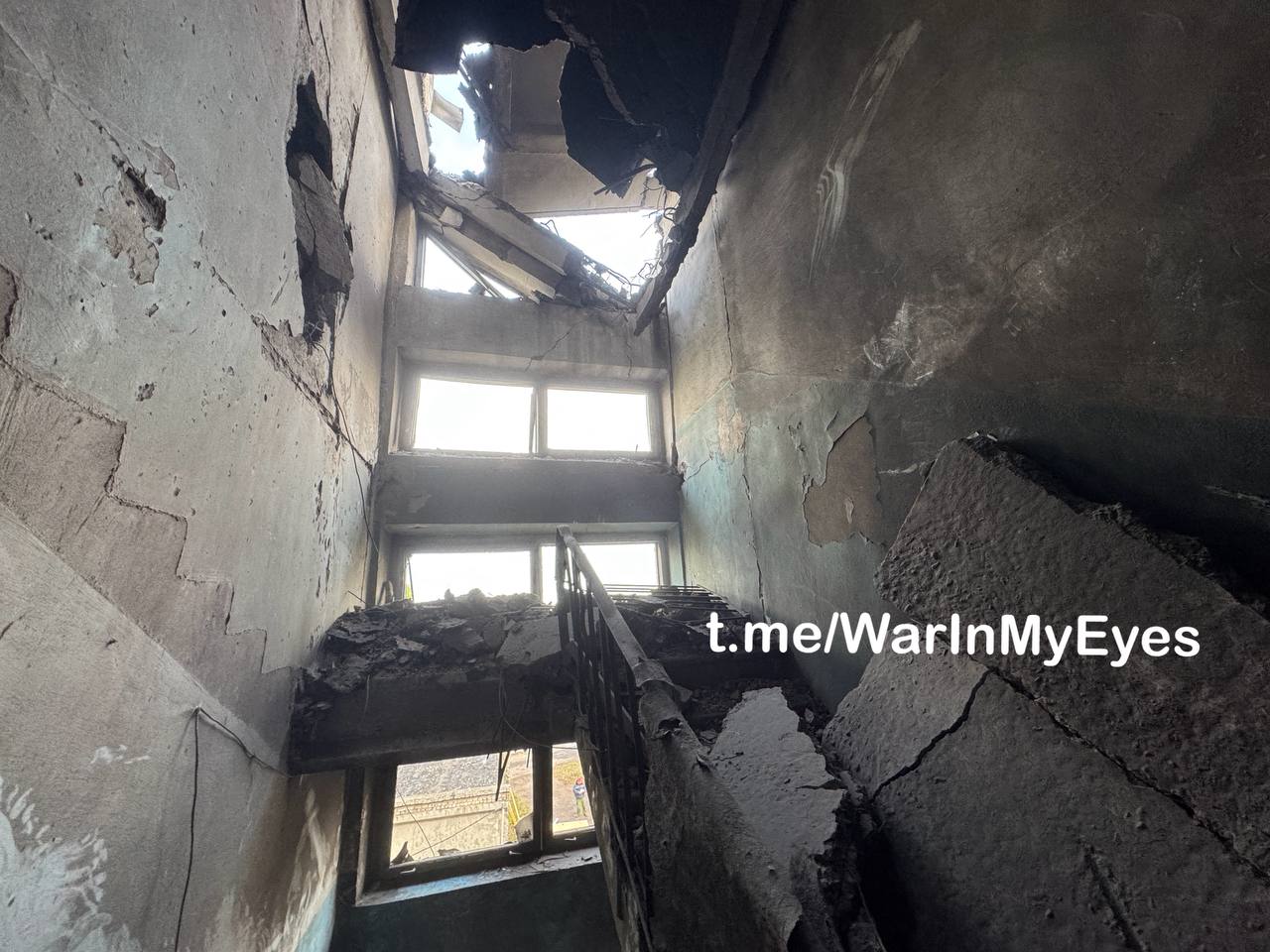 Последствия прилета дрона в 5-ти этажный жилой дом на 103 микрорайоне в Ясиноватой