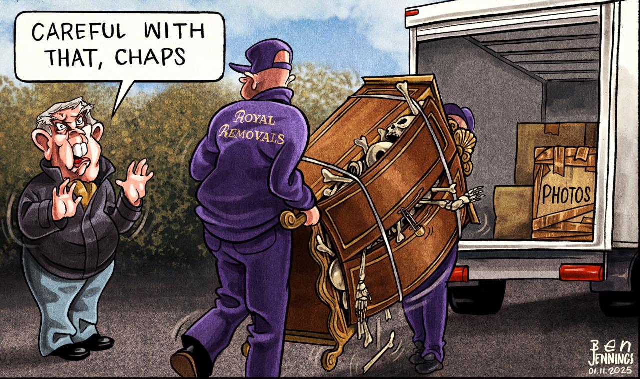 «Осторожнее с этим, ребята!» Как видите, газета i Paper полагает, что Эндрю Виндзор, переезжая из королевского дворца, увозит не только плюшевых мишек, но и много скелетов в шкафу.