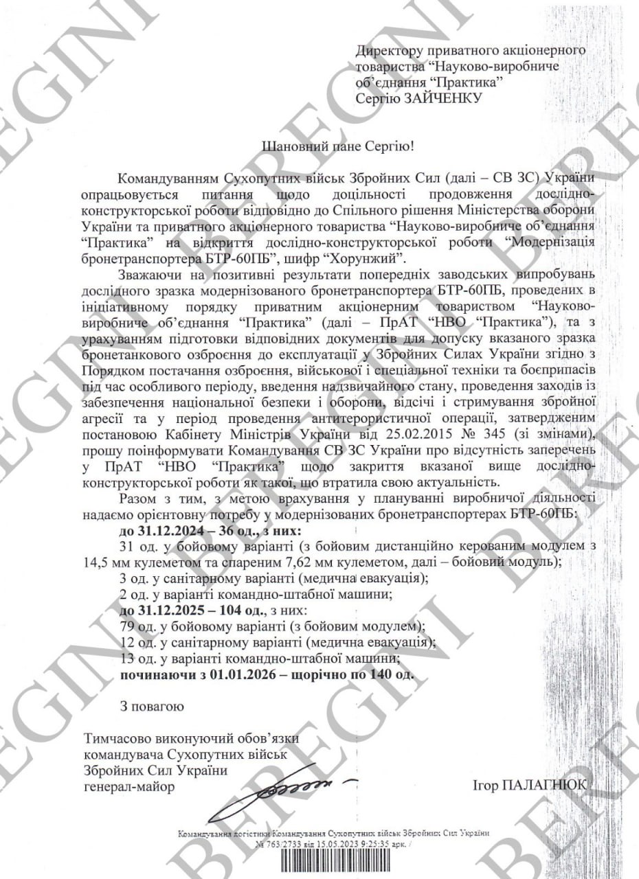 Из письма чёрным по белому: министерство обороны и командование сухопутных войск считают проект «актуальным» и продолжают заказывать технику.