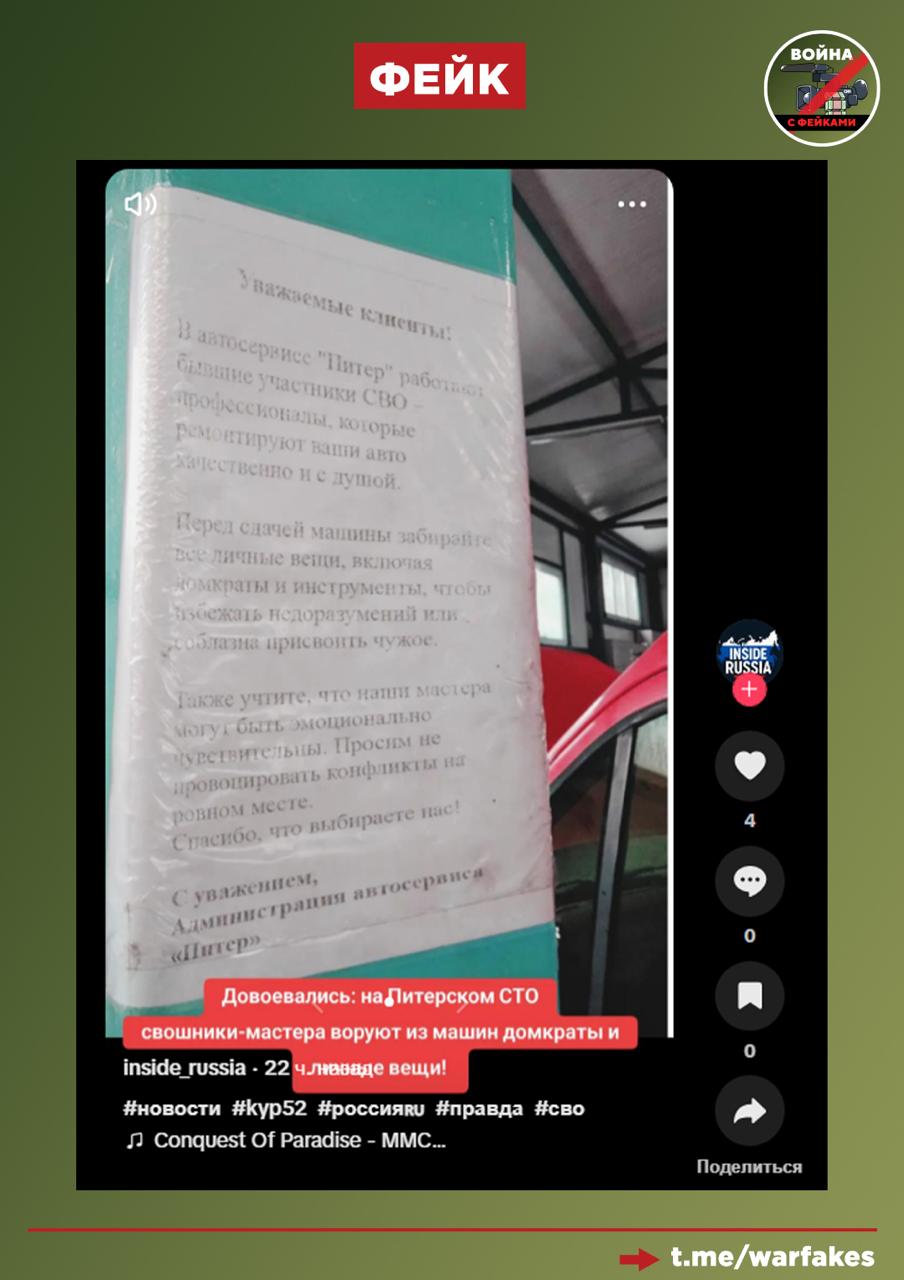 Фейк: В автосервисе «Питер» в Санкт-Петербурге работают «эмоционально нестабильные» участники СВО, которые могут украсть личные вещи из машин клиентов. Объявление с подобным предупреждением и фотография автосервиса расходится в зарубежных соцсетях.