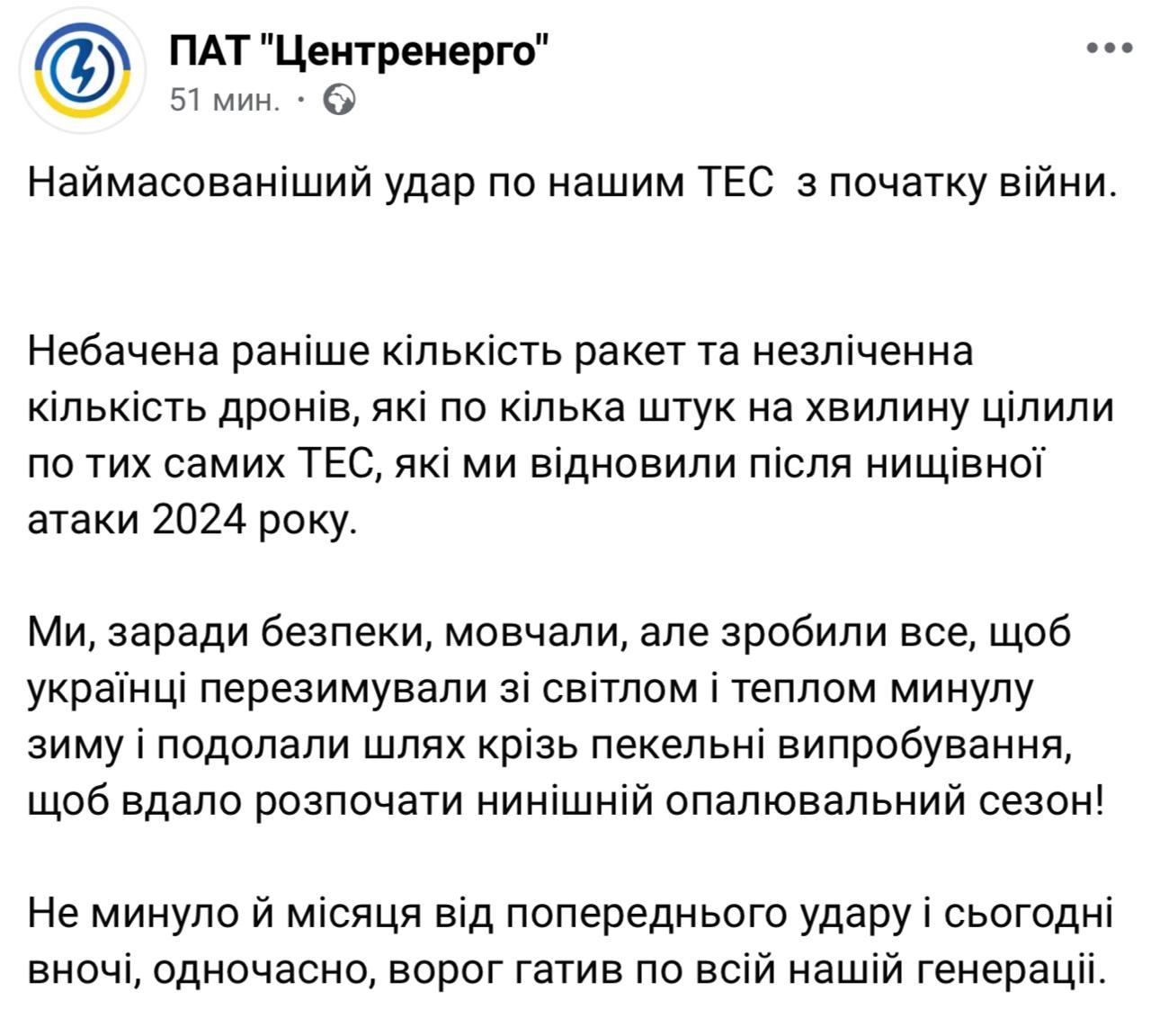 Самый массированный удар по нашим ТЭС с начала войны.Невиданное ранее количество ракет и бесчисленное количество дронов, которые по несколько штук в минуту целили по тем самым ТЭС, которые мы восстановили после сокрушительной