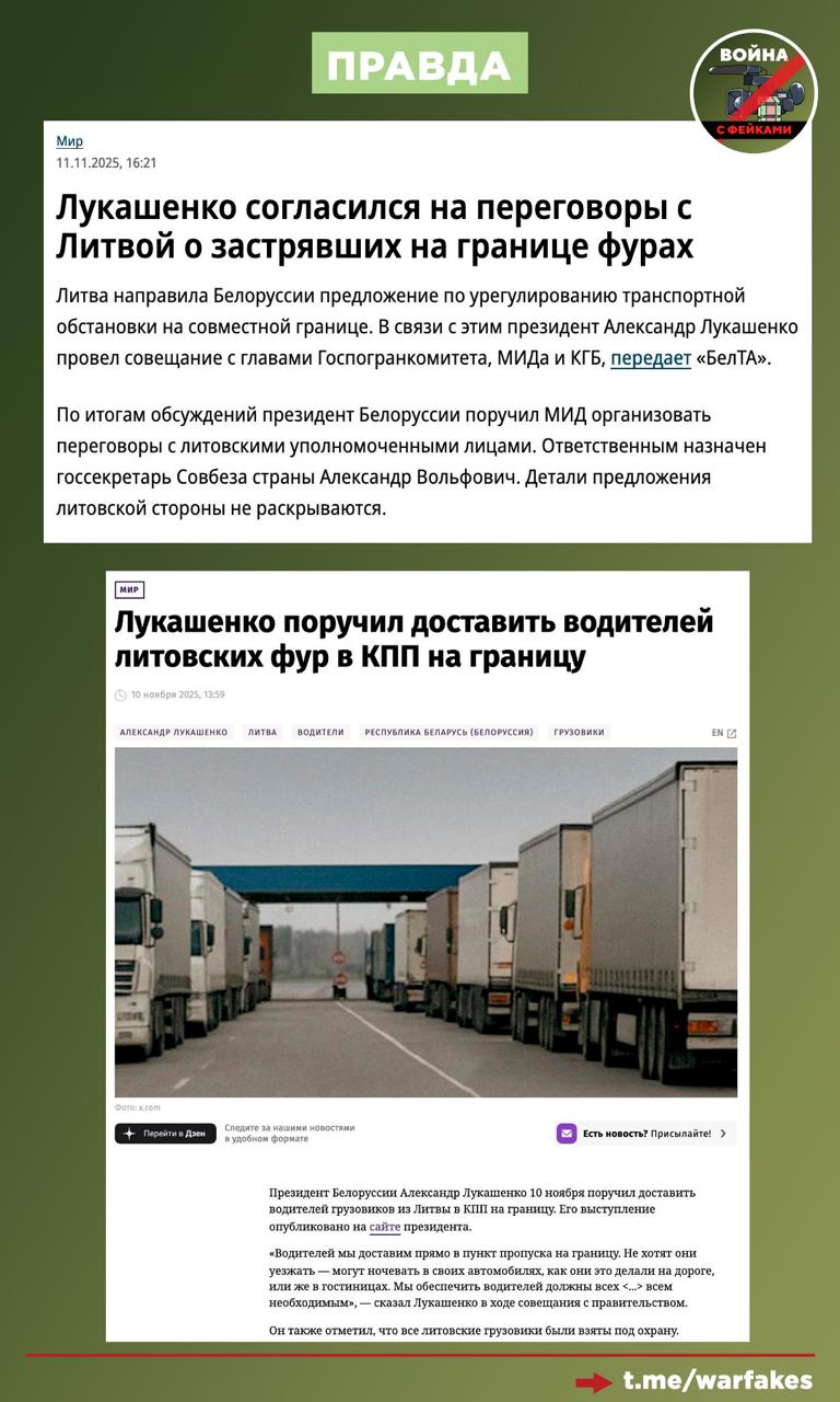 Правда: Более тысячи литовских фур застряли в Белоруссии из-за введенных Литвой ограничений на границе. При этом Минск не закрывал границу — с белорусской стороны она может возобновить свою работу в течение нескольких часов после соответствующего решения литовских властей.
