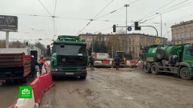 Из-за ошибки рабочих, которые пробили трубопровод, вода начала поступать в грунт, вымывать его, в результате на проспекте Энгельса образовался котлован. О причинах ЧП сообщил вице-губернатор Петербурга Сергей Кропачев.