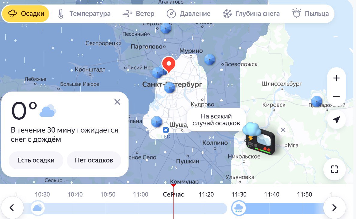 Судя по погодной карте, снег в Петербурге пойдет в районе полудня.