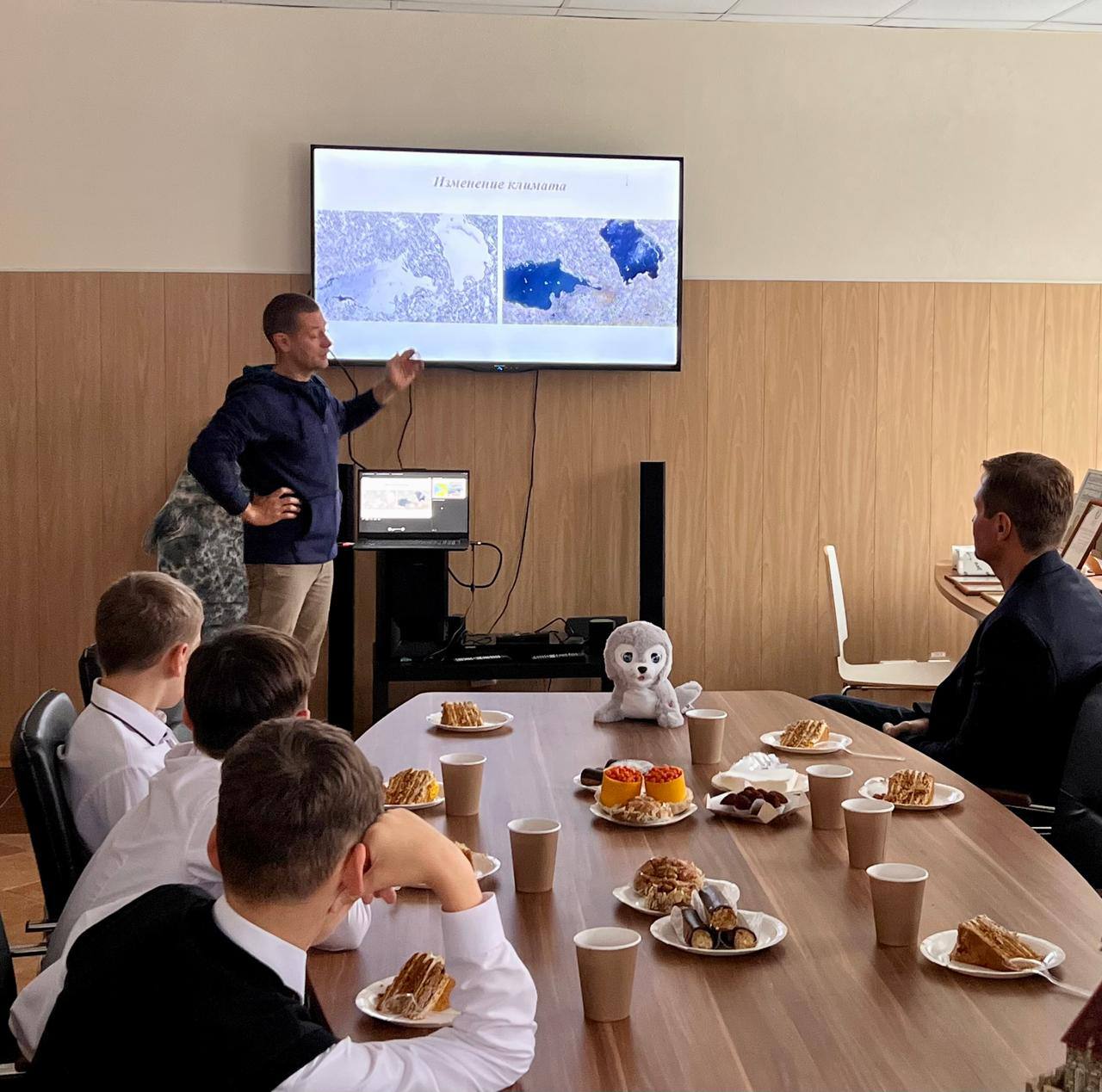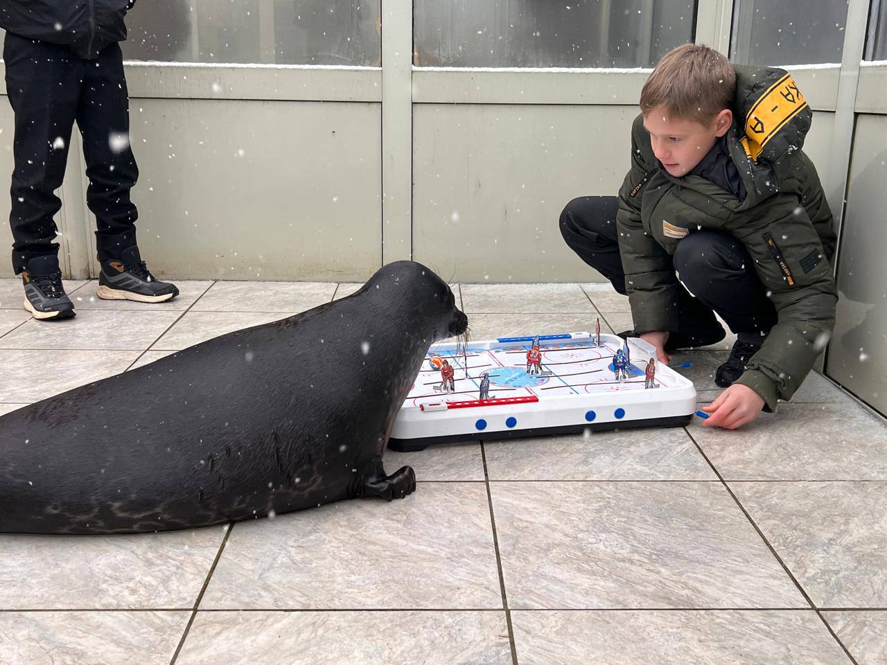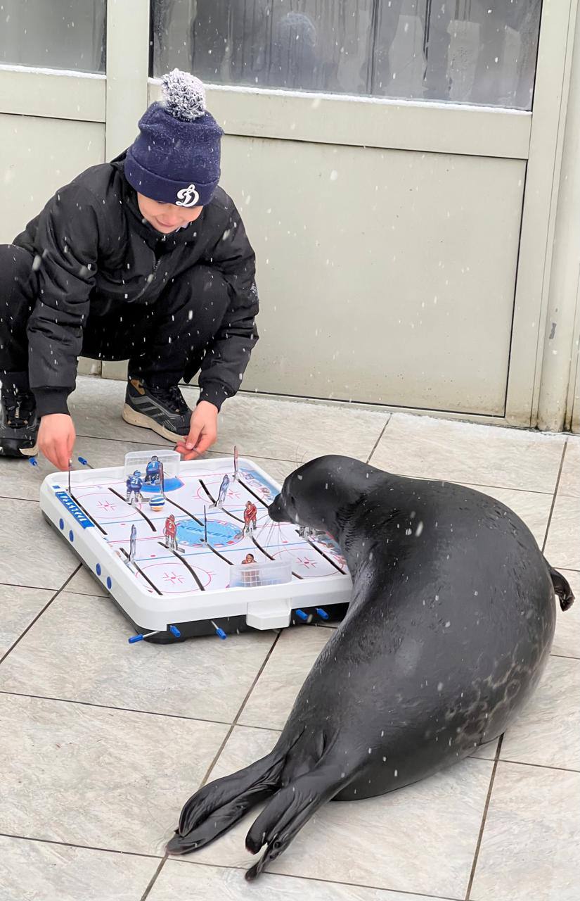 К ластоногому в гости также пришли юные хоккеисты. Шлиссик проверил их умения, сыграв партию в настольный хоккей.