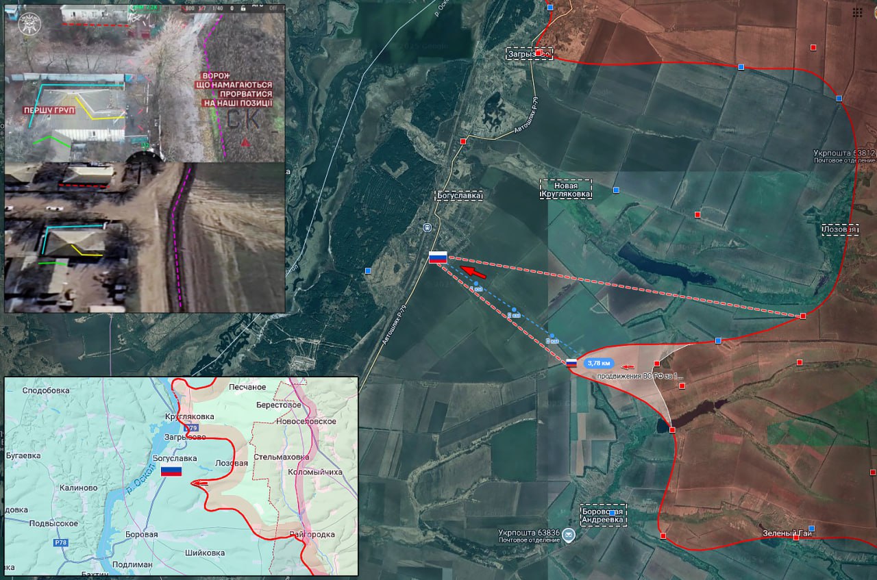 Атака ВС РФ пехотным подразделениям в направлении населённого пункта Богуславка. Штурмовым отрядом заняты позиции в жилой застройке на юге поселка.