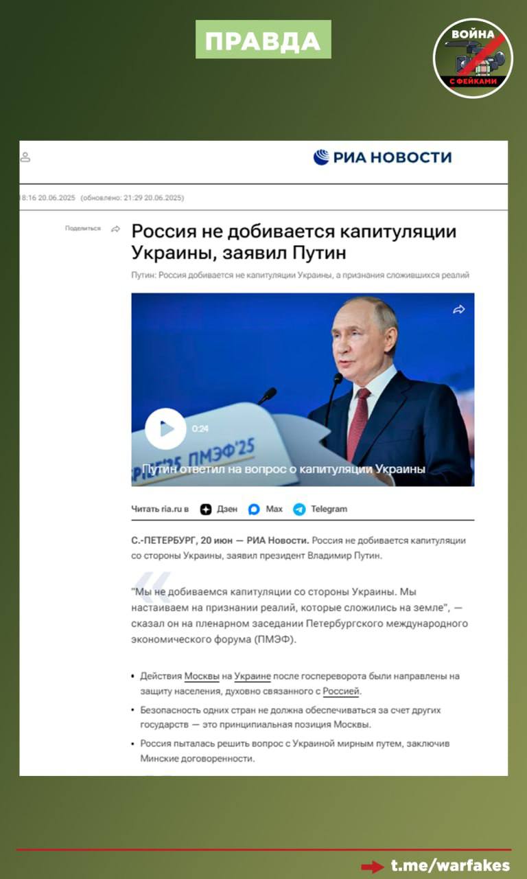 Правда: Россия не добивается капитуляции Украины. Цель России — обеспечить безопасность собственных граждан и добиться установления долгосрочного мира. Для этого требуется провести денацификацию и демилитаризацию Украины, а также закрепить ее внеблоковый статус, о чем неоднократно сообщали официальные лица РФ.